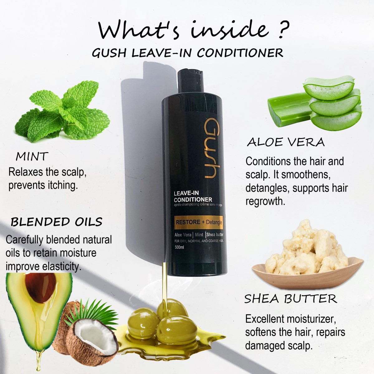 BENEFITS: Gush leave-in conditioner softens, moisturizes and improves manageability while leaving your hair with a luxurious scent. Infused with a rich blend of oils like Olive, Coconut oil and Argan oil. Aloe Vera gel provides silkiness